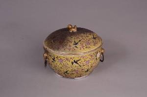 Scaldavivande in porcellana con maniglie pendenti in metallo, basso piede diviso in quattro parti modanate e coperchio con pomello a forma di cane di Fo. Decoro con motivo di gazze tra fiori di pruno rosa su fondo giallo. Contiene all'interno una ciotola con bordo dorato. Entrambe con marchio Guangxu in rosso ferro a quattro caratteri e del periodo.
