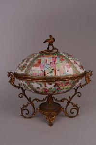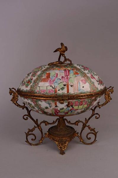 Scatola formata da due semisfere a pianta ovale in porcellana a smalti Famiglia Rosa Cantonese decorate all'esterno e all'interno con cartelle alternanti figure in scene di palazzo e uccelli e farfalle tra rami in fiore, contornati da ulteriore fitto motivo floreale su fondo oro, unite e legate da una cerniera su supporto di bronzo occidentale che presenta uno stelo centrale dal quale si dipartono due piedi di fenice e tralci fitomorfi che fungono da quarto appoggio e vanno a formare due anse a forma di fenice. Sopra al coperchio una fenice occidentale su un ramo.