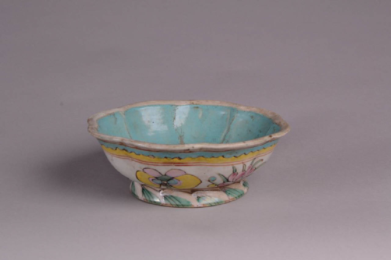 Coppa a fiore aperto, pianta polilobata e basso piede espanso. Smaltata di verde mare sopracoperta all'interno; esterno a fiori e farfalle.