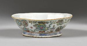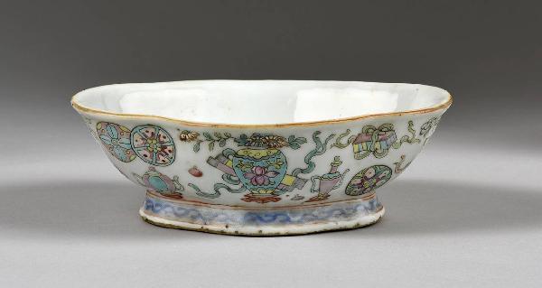 Ciotola a pianta quadrilobata allungata, bordo espanso e basso piede decorato in blu sopracoperta. Decoro a smalti della famiglia rosa raffigurante i "cento oggetti antichi", alla base marchio a sigillo Tongzhi e del periodo (1862-1874).