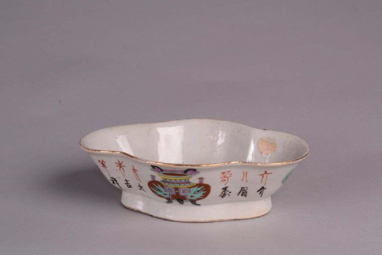 Ciotola a pianta quadrilobata allungata, bordo espanso e basso piede decorato in blu sopracoperta. Decoro a smalti della famiglia rosa raffigurante i "cento oggetti antichi", alla base marchio a sigillo Tongzhi e del periodo (1862-1874).