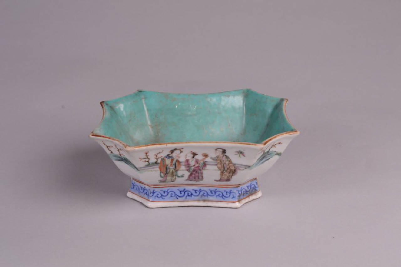 Ciotola a otto lati convessi smaltata internamente, in verde sopracoperta. Decorata all'Esterno in smalti Famiglia Rosa con dame e dignitari in un giardino. Piede decorato con una fascia di girali fitomorfi in blu su fondo azzurro. Alla base marchio a sigillo Tongzhi e del periodo (1862-1874).