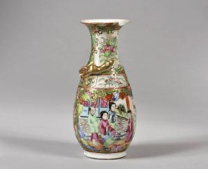Piccolo vaso a balaustro con decorazione Famiglia Rosa di tipo cantonese. Sul corpo decorato con cornici che alternano di fiori, uccello e farfalla, e un mandarino accolto da due dame e un giovane, al collo cartigli con volute a C in verde chiaro e cartigli rettangolari dal bordo celeste, campiti da fiori rosa e fanciullo contronati da fitti motivi floreali con racemi in verde e petali rosa su sfondo dorato