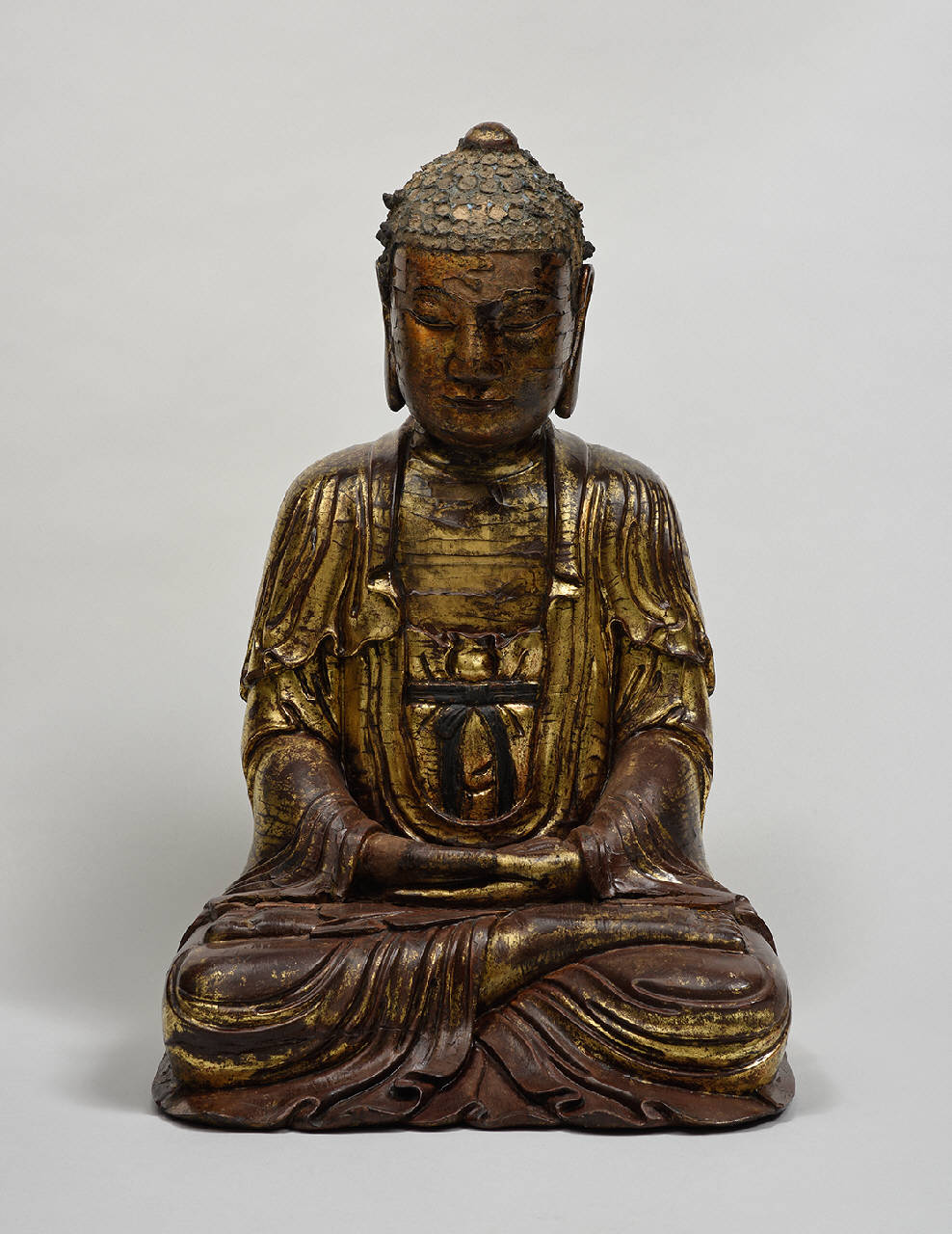 - NOTIZIE STORICO CRITICHE Si tratta probabilmente di una raffigurazione del buddha Amitabha. Il viso piatto ed il naso largo, nonché la conformazione del corpo con spalle spioventi e le profonde pieghe della veste, indicano una probabile produzione della Cina meridionale o delle regioni a sud della Cina. La conformazione del viso ricorda alcuni esemplari dell'epoca Song, ma l'utilizzo, protrattosi anche nei periodi posteriori, di un colore simile al bronzo per la doratura delle parti scoperte del corpo, rimanda ad una consuetudine Ming. L'utilizzo di legno pieno e pesante nel quale è possibile praticare profonde incisioni, e l'utilizzo della lacca a grande spessore sono caratteristici di una produzione relativamente recente secondo tecniche ancora oggi in uso. Al museo Guimet di Parigi è conservato un esemplare simile, in condizioni decisamente migliori, attribuito al Vietnam del XVIII - XIX secolo.