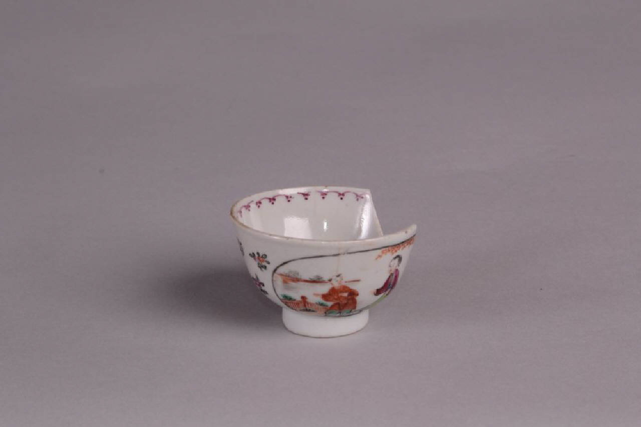 Tazzina a forma di coppetta, famiglia Rosa; decoro entro cartelle ovali di donna con bambino e donna con ventaglio in giardino.