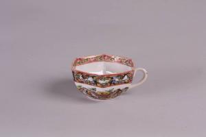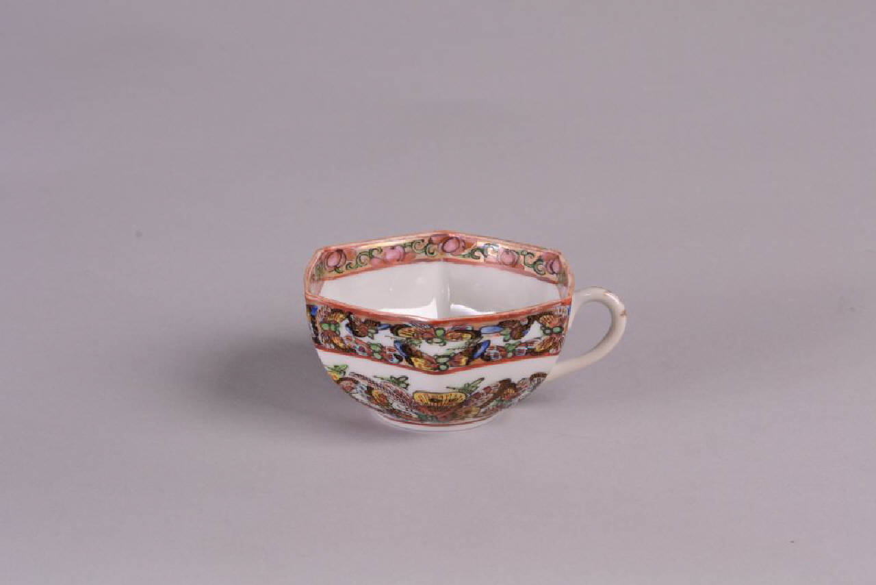 Tazzina esagonale di una serie di 6 (C977-978-979-981-982). In porcellana a smalti policromi sopracoperta con decoro di numerose farfalle in volo e banda a motivi floreali.