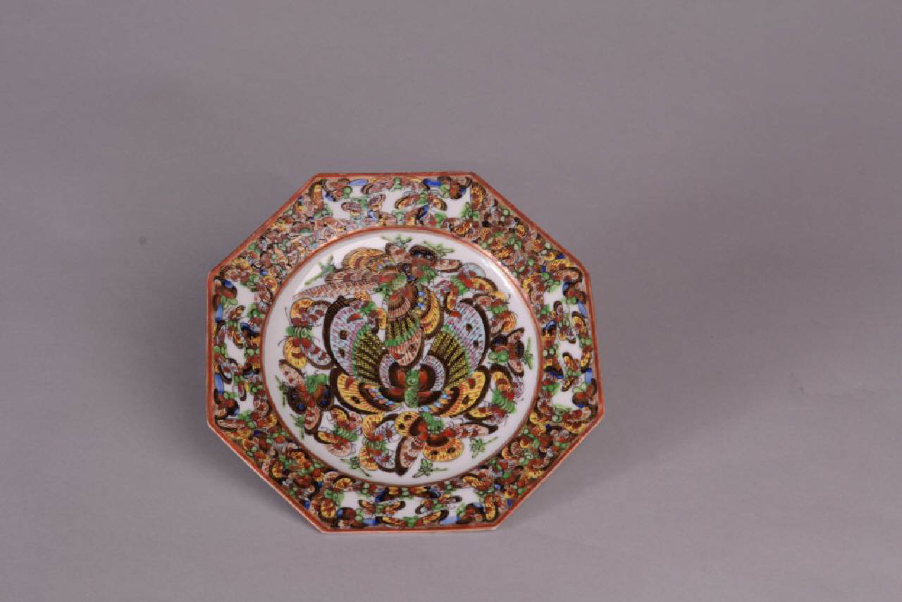 Piattino ottagonale di una serie di 7 (C983-985-986-987-988-989). In porcellana a smalti policromi sopracoperta con decoro di numerose farfalle in volo e banda a motivi floreali.