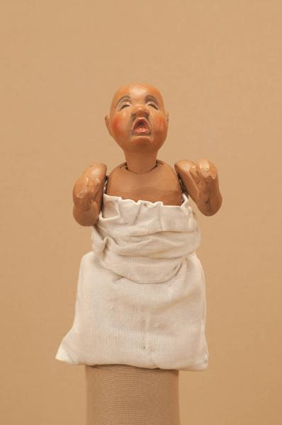 Testa di legno di tiglio fissata al corpo tramite ferro. Corpo e braccia in tiglio. Tasca in tela imbottita di gommapiuma.
