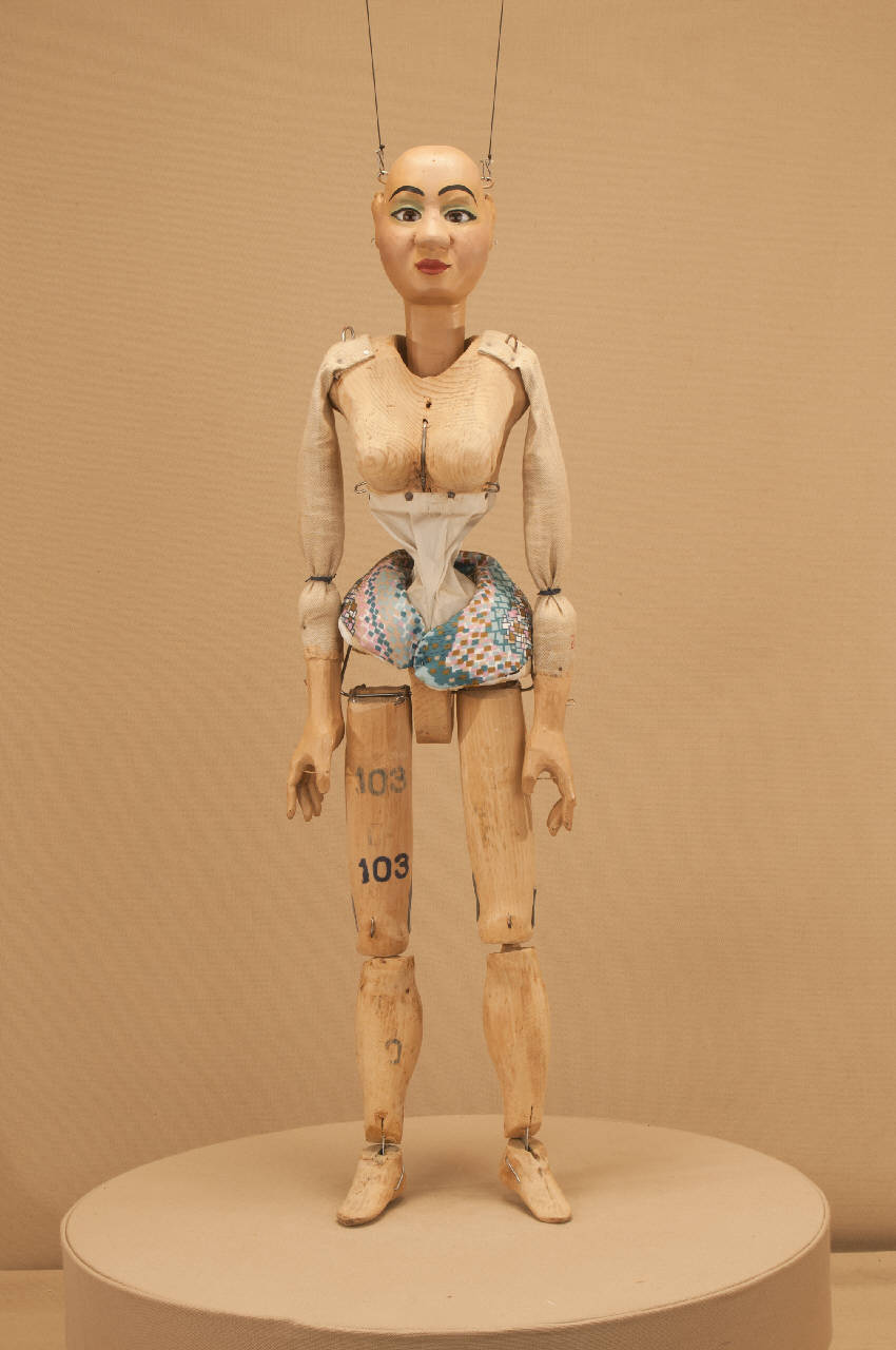 Testa in legno di tiglio fissata al corpo tramite ferro, occhi di vetro. Corpo normale in tiglio tagliato in vita e raccordato con cerniera in metallo. Gambe unite al bacino tramite bordione in ferro, ginocchia ad incastro mobile. Mani in tiglio con dita scolpite e separate. Piedi mobili. Bilancino a croce metodo Holden.