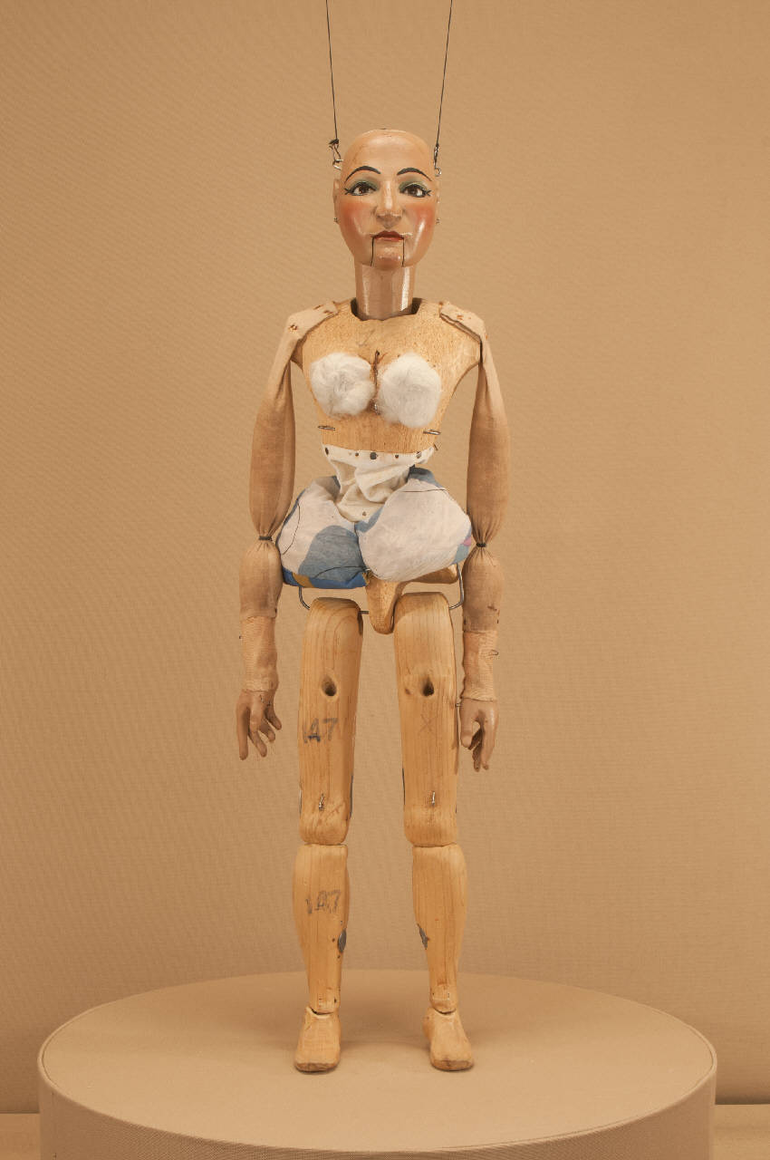 Testa in legno di cirmolo fissata al corpo tramite ferro, occhi di vetro. Bocca mobile. Corpo normale in abete tagliato in vita e raccordato con viti ad anello e tela . Gambe unite al bacino tramite bordione in ferro, ginocchia ad incastro mobile. Mani mobili in tiglio con dita scolpite. Bilancino a croce metodo Holden.