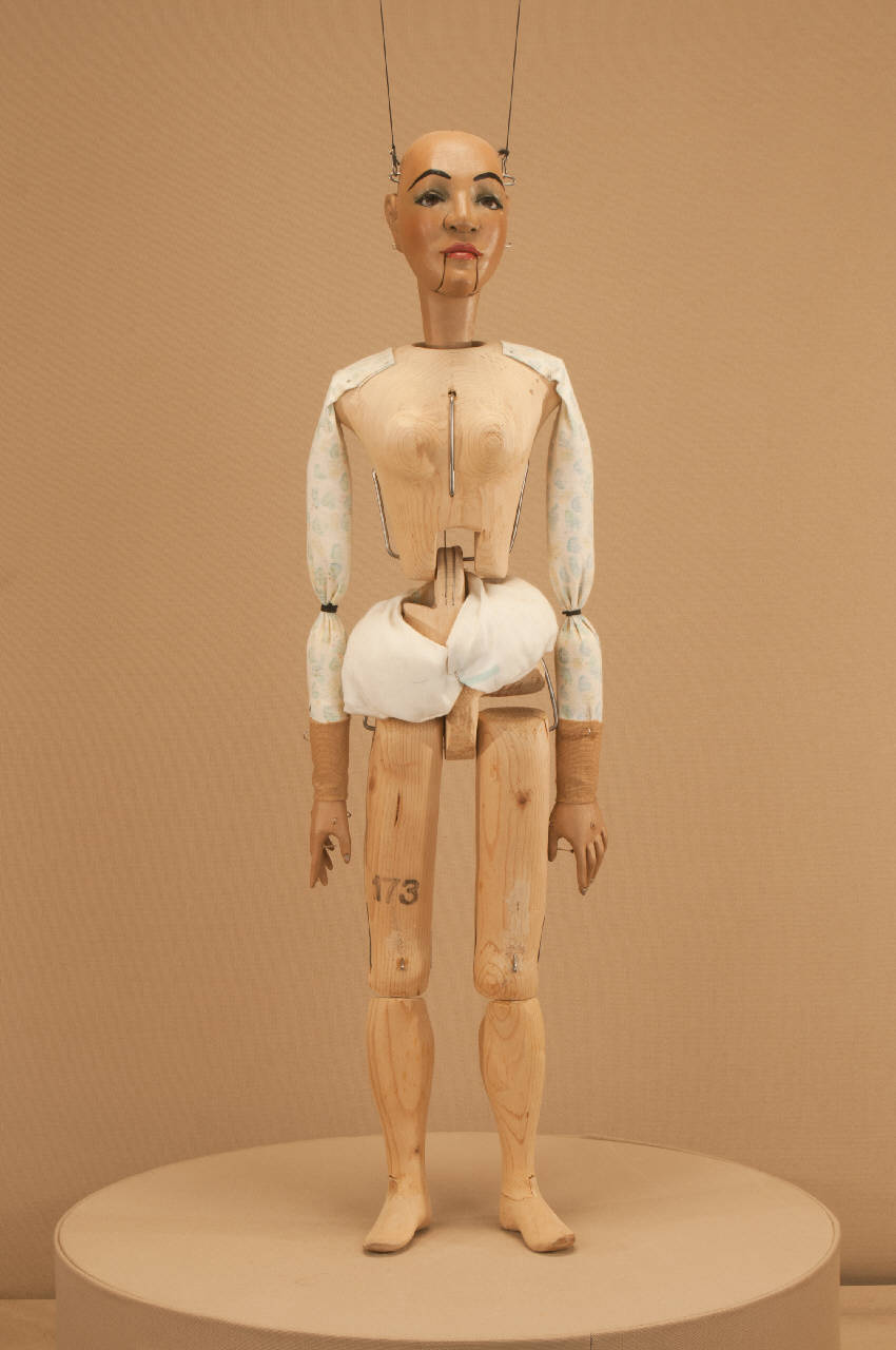 Testa in legno di tiglio fissata al corpo tramite ferro, occhi di vetro. Bocca mobile. Corpo normale in abete snodato in vita ad incastro. Gambe unite al bacino tramite bordione in ferro, ginocchia ad incastro mobile. Mani mobili in tiglio con dita scolpite e separate. Bilancino a croce metodo Holden.