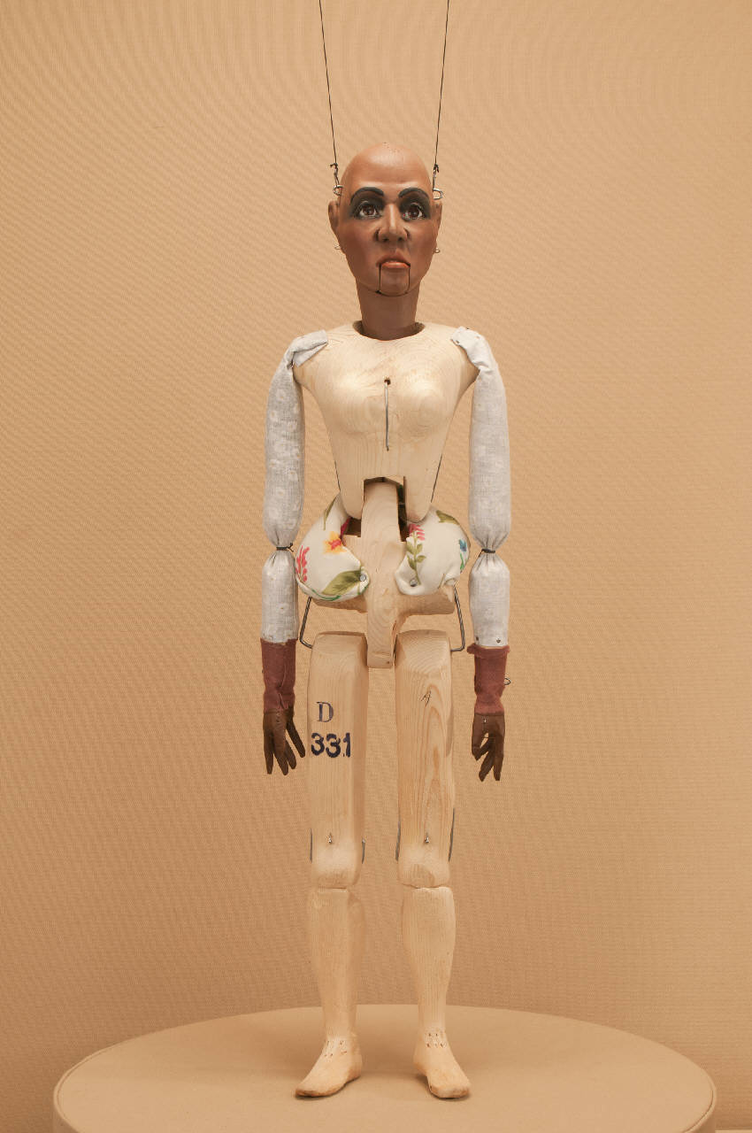 Testa in legno di tiglio fissata al corpo tramite ferro, occhi di vetro, bocca mobile. Corpo normale in abete snodato in vita ad incastro. Gambe unite al bacino tramite bordione in ferro, ginocchia ad incastro mobile. Mani mobili in tiglio con dita scolpite e separate. Bilancino a croce per coppie.
