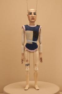 Testa di legno di tiglio fissata al corpo tramite ferro, occhi di vetro, bocca mobile. Corpo normale in abete. Gambe unite al bacino tramite bordione in ferro, ginocchia ad incastro mobile. Mani in tiglio con dita scolpite e separate. Bilancino a croce per coppie.