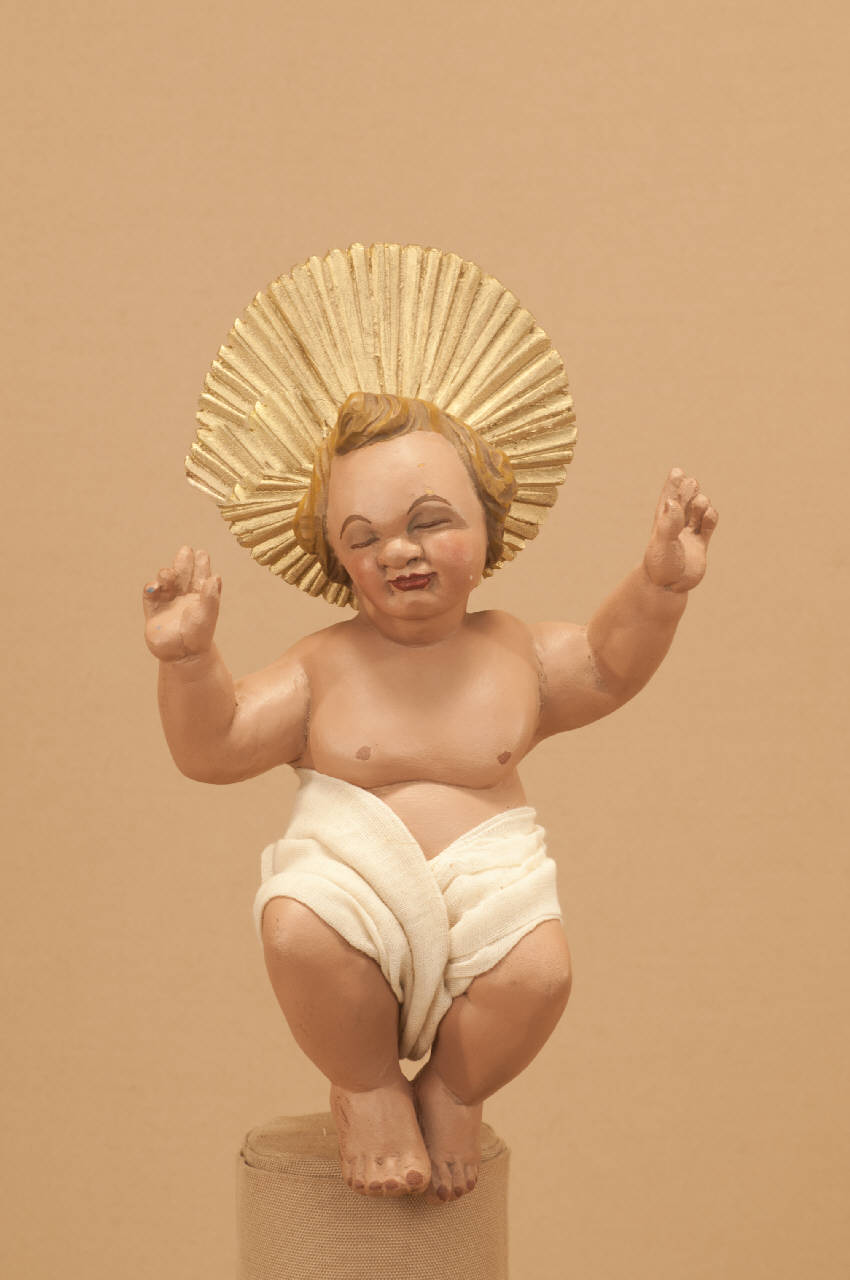 Scultura in legno di tiglio. Capelli scolpiti e grande aureola dorata dietro alla testa.