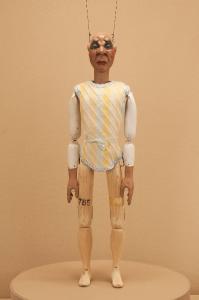 Testa di legno di tiglio fissata al corpo tramite ferro, occhi di vetro. Corpo normale in abete. Gambe unite al bacino tramite bordione in ferro, ginocchia ad incastro mobile. Mani in tiglio con dita scolpite e separate. Bilancino a croce per coppie.