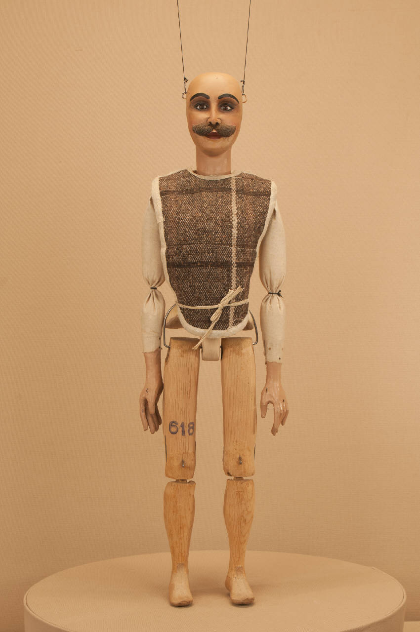 Testa in legno di faggio fissata al corpo tramite ferro, occhi di vetro. Baffi scolpiti. Corpo normale in abete. Gambe unite al bacino tramite bordione in ferro, ginocchia ad incastro mobile. Mani in tiglio con dita scolpite e separate. Bilancino tradizionale per coppie.