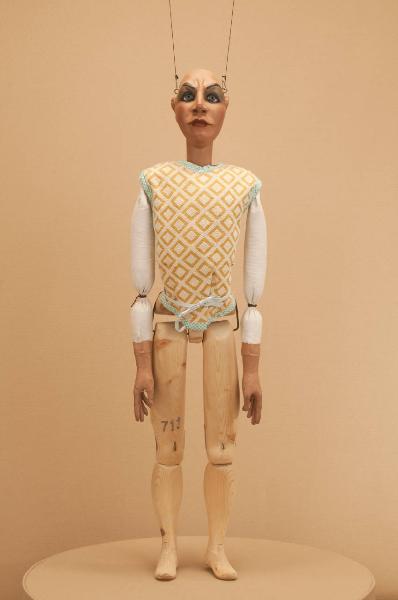 Testa di legno di tiglio fissata al corpo tramite ferro, occhi di vetro. Corpo normale in abete. Gambe unite al bacino tramite bordione in ferro, ginocchia ad incastro mobile. Mani in tiglio con dita scolpite e separate. Bilancino tradizionale per coppie.