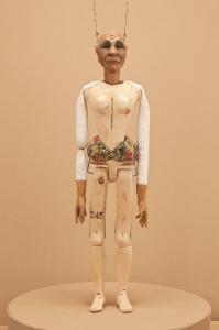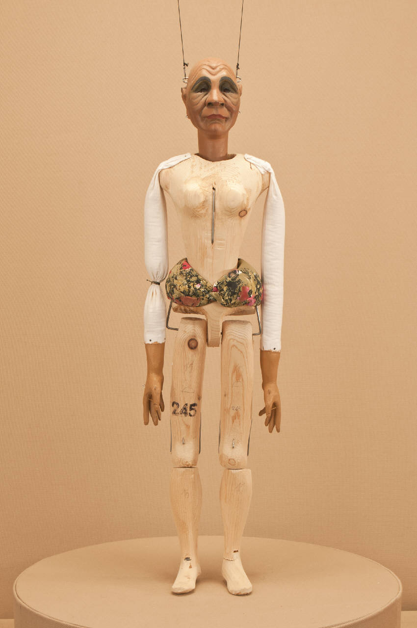 Testa di legno di tiglio fissata al corpo tramite ferro, occhi di vetro. Corpo normale in abete. Gambe unite al bacino tramite bordione in ferro, ginocchia ad incastro mobile. Mani in tiglio con dita scolpite e separate. Bilancino a croce per coppie.