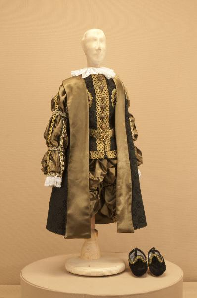 Costume da nobiluomo di foggia seicentesca composto da braghe, farsetto, cintura, gorgiera, scarpe e sopravveste.