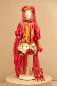 Costume maschile fantastico composto da brache, veste, velo, calzari e acconciatura.