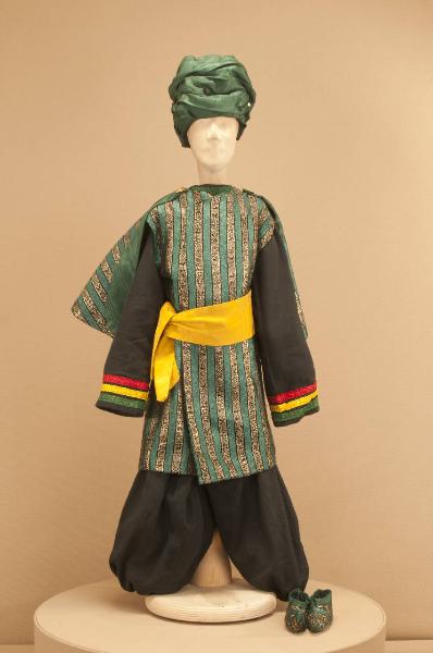 Costume folcloristico orientale composto da pantaloni, corpino, sopravveste, fusciacca, mantellina e scarpe. Il turbante che completa il costume ha il codice GOR 06805.