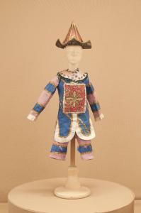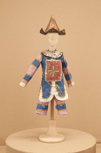 - NOTIZIE STORICO CRITICHE Il costume si completa con un paio di calzature in stile. Lo spettacolo "Il drago verde" è una grandiosa azione coreografica in nove quadri messa in scena da Carlo Colla per la Compagnia Marionettistica Carlo Colla e Figli. La musica è stata composta dai maestri Strigazzi e Gualtieri e le ricchissime scene sono state dipinte da A. Lualdi e L. Mens.\nLo spettacolo, in repertorio fin dalla metà dell¿Ottocento col titolo "I riti chinesi" e indicato sui libri mastri come "Ballo I Chinesi" e sui tamburini del quotidiano "La Sera" come Drago Verde (dal 1913 al 1918), fu rielaborato per un nuovo allestimento solo nel 1948 dopo un lungo oblio e presentato nuovamente sulle scene del Teatro Gerolamo di Milano. Lo spettacolo è stato ripreso nel 1985 al Teatro dell'Arte e portato a Berlino per il Festival Horizonte.\nContrariamente a quanto il titolo farebbe pensare non si tratta di un tema fiabesco, ma di un ballo a sfondo storico sulla lotta per il potere delle dinastie imperiali. Il drago a cui si allude nel titolo è un idolo che protegge la dinastia regnante e aiuta a sconfiggere ogni tentativo di rivolta della deposta dinastia.