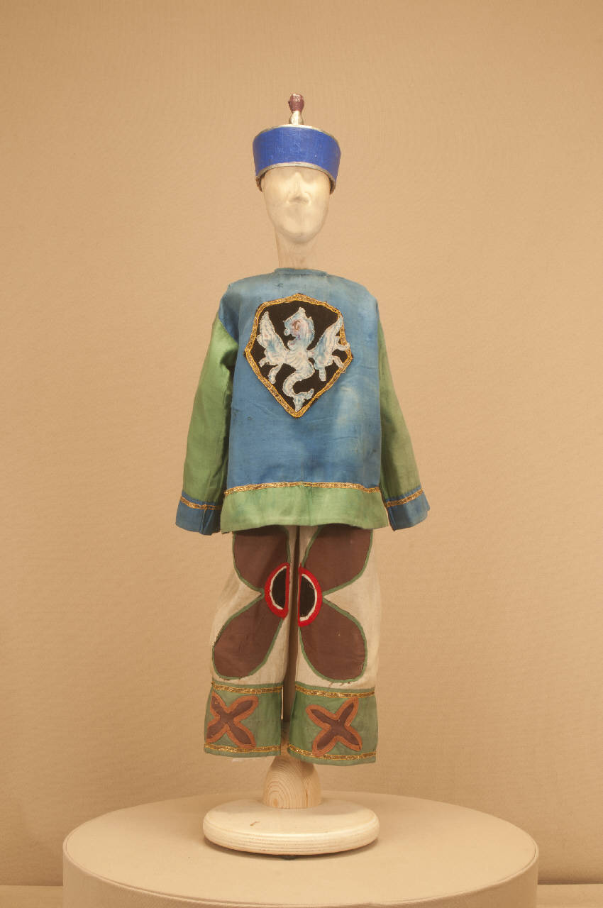 - NOTIZIE STORICO CRITICHE Il costume si completa con un paio di calzature in stile. Lo spettacolo "Il drago verde" è una grandiosa azione coreografica in nove quadri messa in scena da Carlo Colla per la Compagnia Marionettistica Carlo Colla e Figli. La musica è stata composta dai maestri Strigazzi e Gualtieri e le ricchissime scene sono state dipinte da A. Lualdi e L. Mens.\nLo spettacolo, in repertorio fin dalla metà dell¿Ottocento col titolo "I riti chinesi" e indicato sui libri mastri come "Ballo I Chinesi" e sui tamburini del quotidiano "La Sera" come Drago Verde (dal 1913 al 1918), fu rielaborato per un nuovo allestimento solo nel 1948 dopo un lungo oblio e presentato nuovamente sulle scene del Teatro Gerolamo di Milano. Lo spettacolo è stato ripreso nel 1985 al Teatro dell'Arte e portato a Berlino per il Festival Horizonte.\nContrariamente a quanto il titolo farebbe pensare non si tratta di un tema fiabesco, ma di un ballo a sfondo storico sulla lotta per il potere delle dinastie imperiali. Il drago a cui si allude nel titolo è un idolo che protegge la dinastia regnante e aiuta a sconfiggere ogni tentativo di rivolta della deposta dinastia.