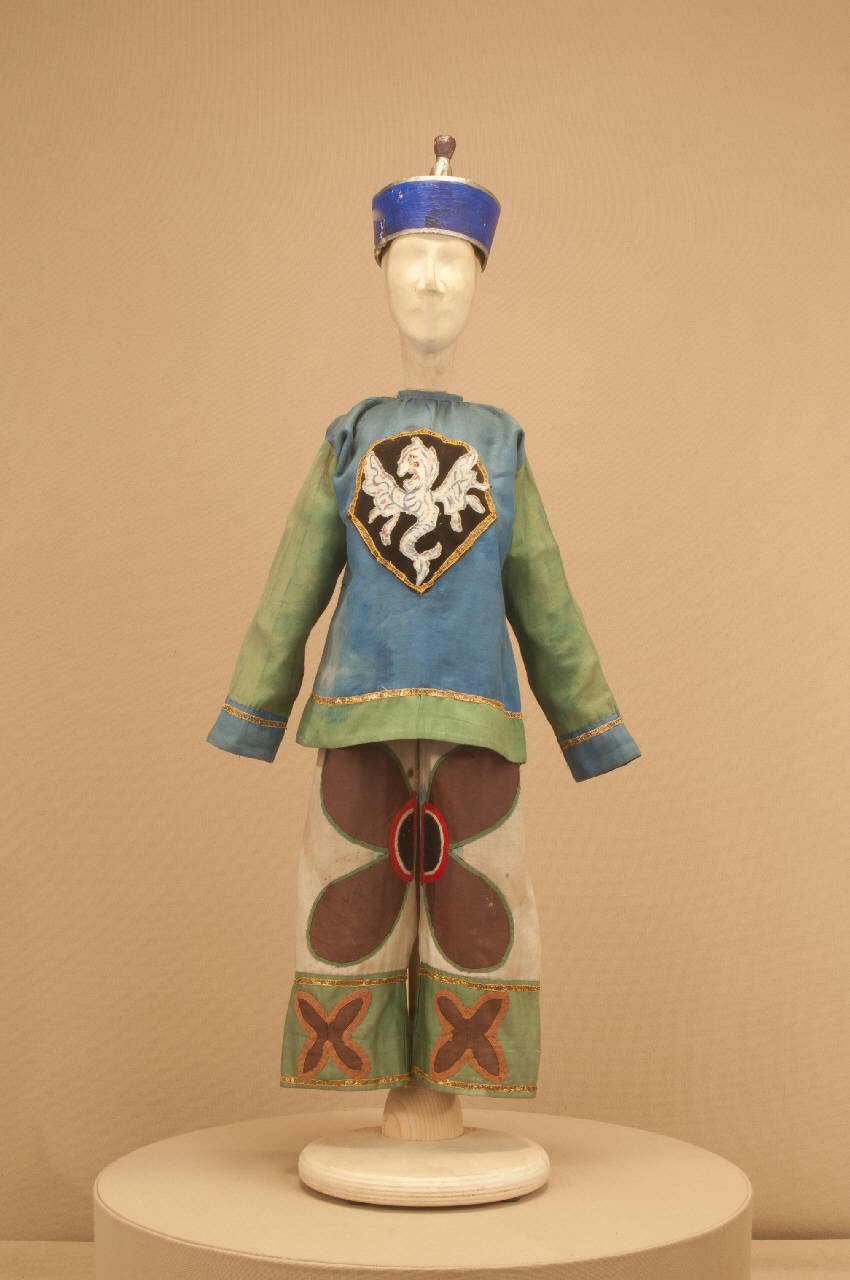 - NOTIZIE STORICO CRITICHE Il costume si completa con un paio di calzature in stile. Lo spettacolo "Il drago verde" è una grandiosa azione coreografica in nove quadri messa in scena da Carlo Colla per la Compagnia Marionettistica Carlo Colla e Figli. La musica è stata composta dai maestri Strigazzi e Gualtieri e le ricchissime scene sono state dipinte da A. Lualdi e L. Mens.\nLo spettacolo, in repertorio fin dalla metà dell¿Ottocento col titolo "I riti chinesi" e indicato sui libri mastri come "Ballo I Chinesi" e sui tamburini del quotidiano "La Sera" come Drago Verde (dal 1913 al 1918), fu rielaborato per un nuovo allestimento solo nel 1948 dopo un lungo oblio e presentato nuovamente sulle scene del Teatro Gerolamo di Milano. Lo spettacolo è stato ripreso nel 1985 al Teatro dell'Arte e portato a Berlino per il Festival Horizonte.\nContrariamente a quanto il titolo farebbe pensare non si tratta di un tema fiabesco, ma di un ballo a sfondo storico sulla lotta per il potere delle dinastie imperiali. Il drago a cui si allude nel titolo è un idolo che protegge la dinastia regnante e aiuta a sconfiggere ogni tentativo di rivolta della deposta dinastia.