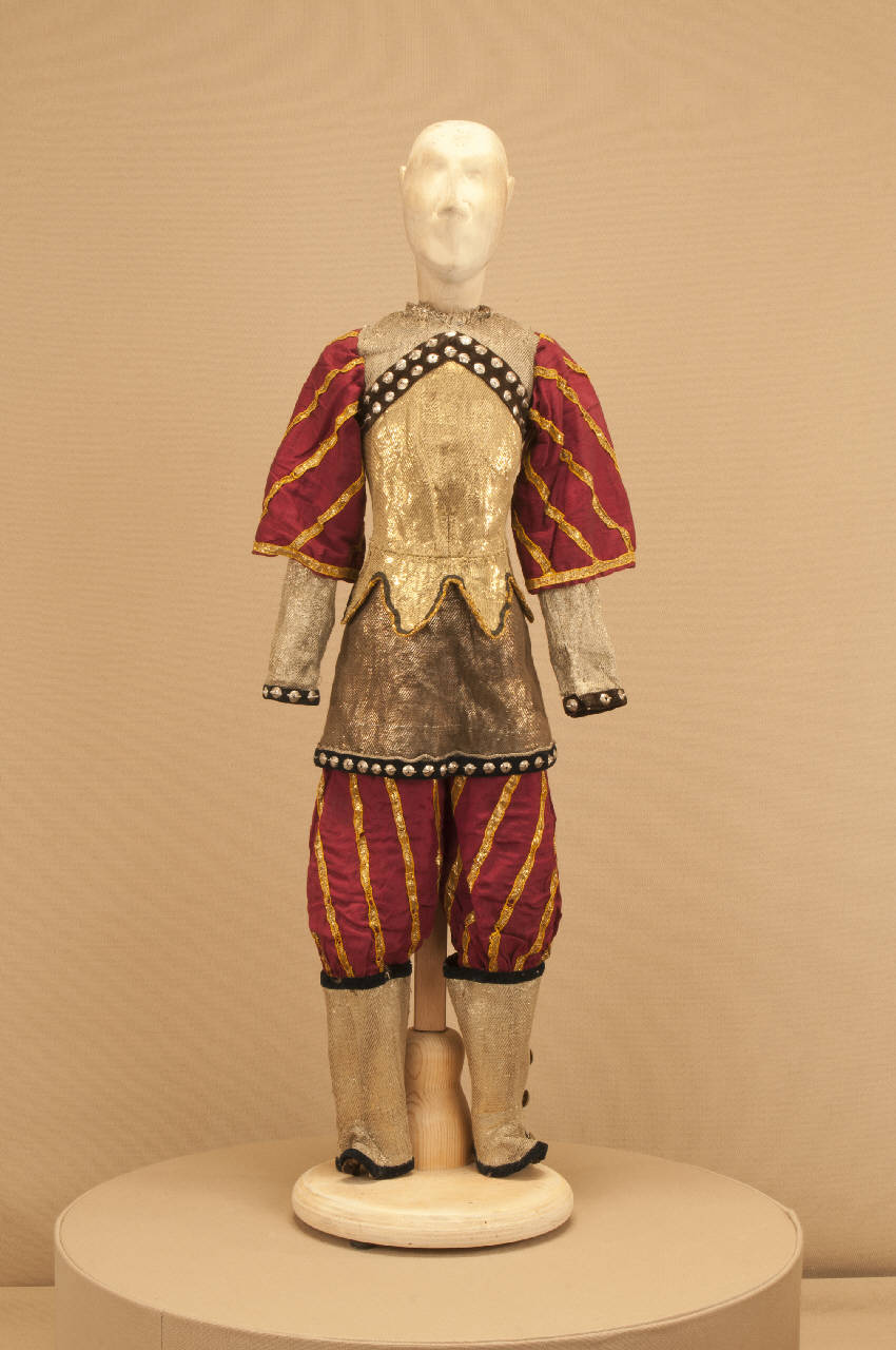 - NOTIZIE STORICO CRITICHE Il costume si completa con un paio di calzature in stile e con un elmo. La giacca e il cappello risalgono al 1849, data in cui andò in scena lo spettacolo con il nome "I riti chinesi"; i pantaloni al 1948. Lo spettacolo "Il drago verde" è una grandiosa azione coreografica in nove quadri messa in scena da Carlo Colla per la Compagnia Marionettistica Carlo Colla e Figli. La musica è stata composta dai maestri Strigazzi e Gualtieri e le ricchissime scene sono state dipinte da A. Lualdi e L. Mens.\nLo spettacolo, in repertorio fin dalla metà dell¿Ottocento col titolo "I riti chinesi" e indicato sui libri mastri come "Ballo I Chinesi" e sui tamburini del quotidiano "La Sera" come Drago Verde (dal 1913 al 1918), fu rielaborato per un nuovo allestimento solo nel 1948 dopo un lungo oblio e presentato nuovamente sulle scene del Teatro Gerolamo di Milano. Lo spettacolo è stato ripreso nel 1985 al Teatro dell'Arte e portato a Berlino per il Festival Horizonte.\nContrariamente a quanto il titolo farebbe pensare non si tratta di un tema fiabesco, ma di un ballo a sfondo storico sulla lotta per il potere delle dinastie imperiali. Il drago a cui si allude nel titolo è un idolo che protegge la dinastia regnante e aiuta a sconfiggere ogni tentativo di rivolta della deposta dinastia.