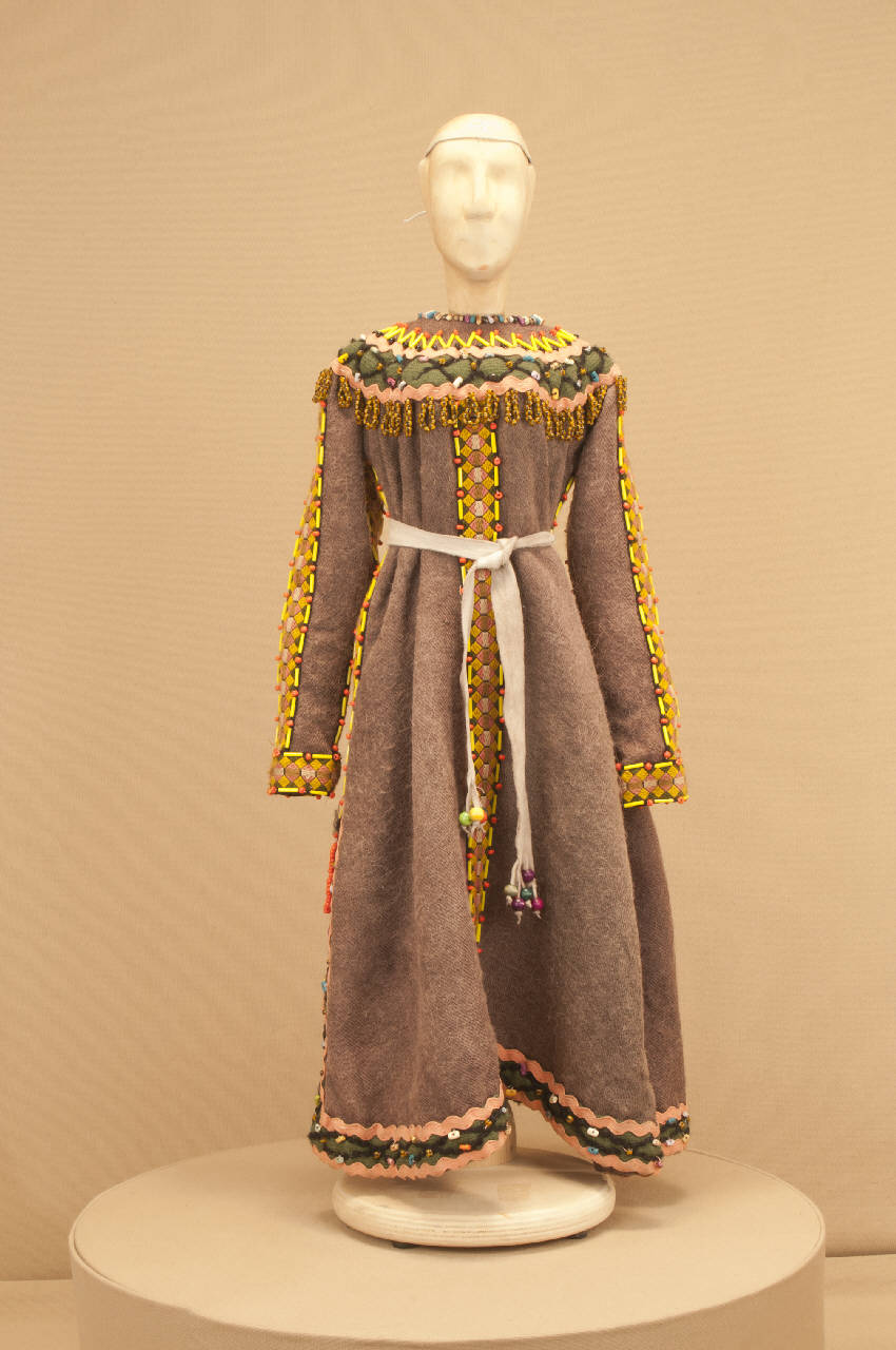 Costume folcloristico per donna pellerossa composto da veste, cintura e striscia in pelle per testa.