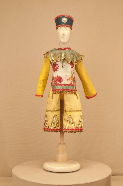 - NOTIZIE STORICO CRITICHE Il costume si completa con un paio di calzature in stile. Lo spettacolo "Il drago verde" è una grandiosa azione coreografica in nove quadri messa in scena da Carlo Colla per la Compagnia Marionettistica Carlo Colla e Figli. La musica è stata composta dai maestri Strigazzi e Gualtieri e le ricchissime scene sono state dipinte da A. Lualdi e L. Mens.\nLo spettacolo, in repertorio fin dalla metà dell¿Ottocento col titolo " riti chinesi" e indicato sui libri mastri come "Ballo I Chinesi" e sui tamburini del quotidiano "La Sera" come Drago Verde (dal 1913 al 1918), fu rielaborato per un nuovo allestimento solo nel 1948 dopo un lungo oblio e presentato nuovamente sulle scene del Teatro Gerolamo di Milano. Lo spettacolo è stato ripreso nel 1985 al Teatro dell'Arte e portato a Berlino per il Festival Horizonte.\nContrariamente a quanto il titolo farebbe pensare non si tratta di un tema fiabesco, ma di un ballo a sfondo storico sulla lotta per il potere delle dinastie imperiali. Il drago a cui si allude nel titolo è un idolo che protegge la dinastia regnante e aiuta a sconfiggere ogni tentativo di rivolta della deposta dinastia.