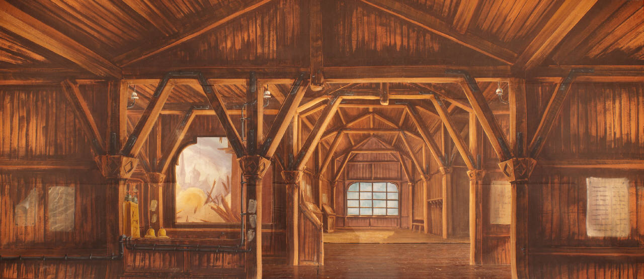 Scenografia composta da un fondale e due principali. Supporto in carta siling avana extra da 80 g. al mq. dipinto con colori a terra uniti con leganti vinilici e fortezzato con strisce in tela di cotone di diverse grammature lungo i bordi perimetrali e lungo le linee di piegatura.