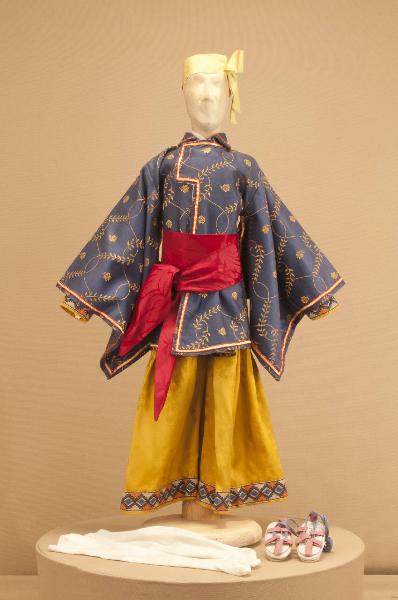 Costume da uomo giapponese composto da kimono, veste con pantaloni, fascia, collo, calze, fascia per la testa e sandali.