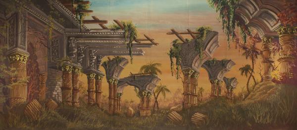 Scenografia composta da un fondale. Supporto in carta siling avana extra da 80 g. al mq. dipinto con colori a terra uniti con leganti vinilici e fortezzato con strisce in tela di cotone di diverse grammature lungo i bordi perimetrali e lungo le linee di piegatura.