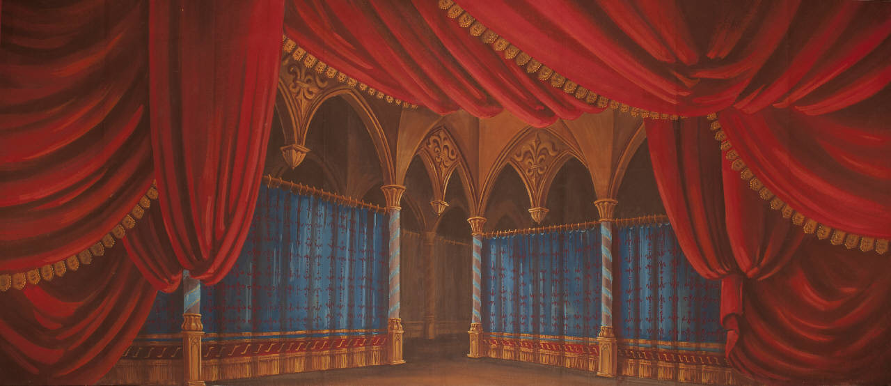 Scenografia composta da un solo fondale. Supporto in carta siling avana extra da 80 g. al mq. dipinto con colori a terra uniti con leganti vinilici. Fortezzature ribattute con strisce in tela di cotone di diverse grammature lungo i bordi perimetrali e lungo le linee di piegatura.