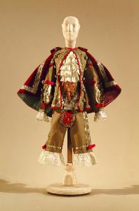 Costume per cavaliere del 1600, composto da pantaloni, giacca, camicia, cintura con borsetta, mantellina