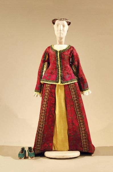 Costume per dama del 1600, composto da gonna, corpino, cuffietta e scarpe