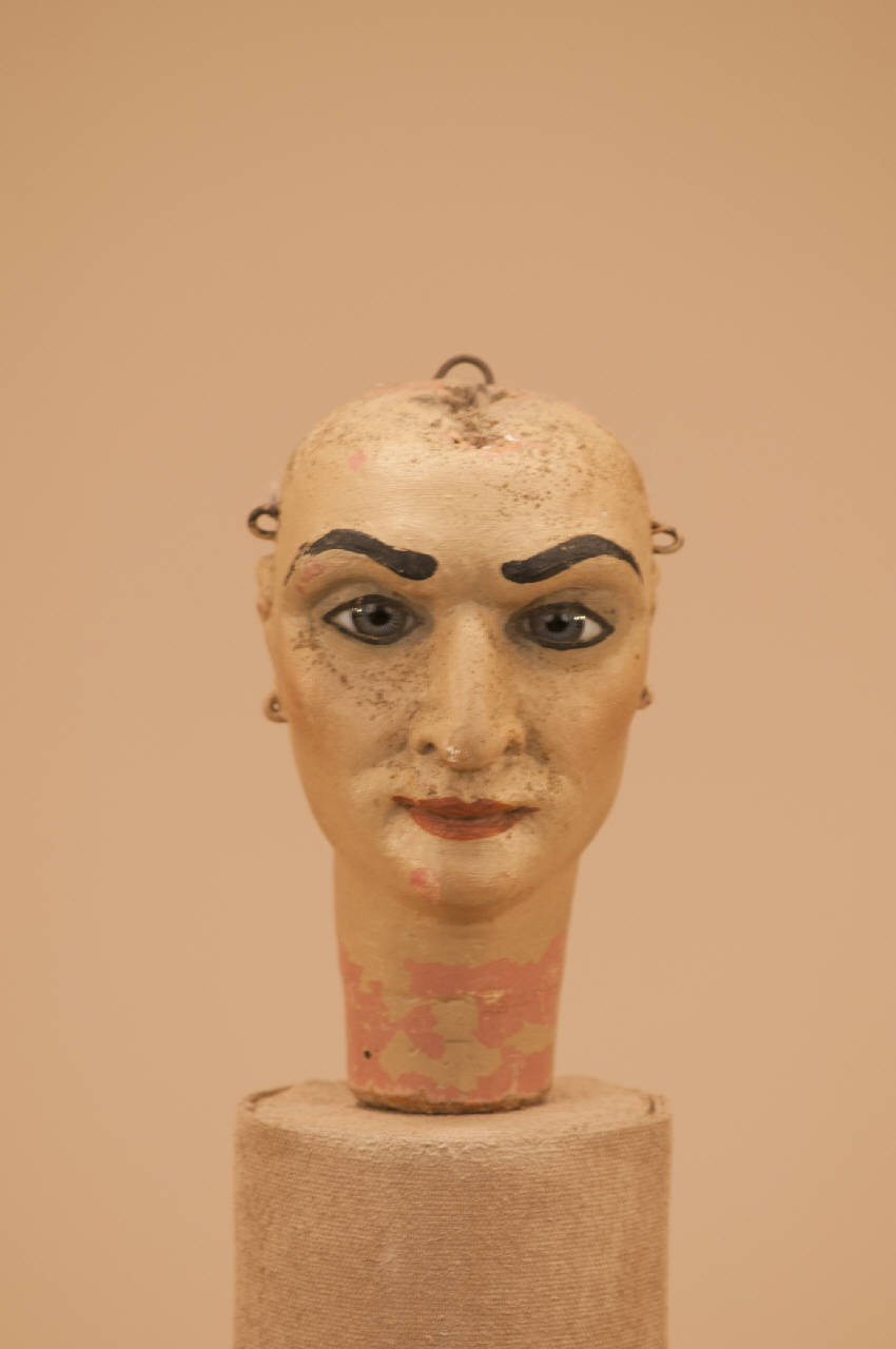 - NOTIZIE STORICO CRITICHE Spilli ai lobi delle orecchie per poter appendere eventuali orecchini. Testa per corpo di taglia piccola tipo quelli delle marionette della miniera dello spettacolo Excelsior. Gancio alla sommità del capo che serviva probabilmente al ferro per l'antico movimento a pugnetto.