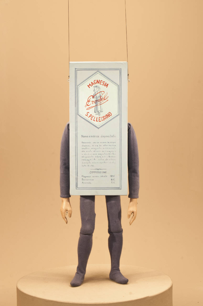 - NOTIZIE STORICO CRITICHE Marionetta realizzata per un Venerdì dell'Atelier della stagione 2009/10. In quell'occasione vennero rimessi in scena i tre spettacoli pubblicitari che a partire dal 1936 venivano periodicamente ripetuti al Teatro Gerolamo dalla Compagnia Carlo Colla e Figli. In particolare questa marionetta è stata creata nei laboratori dell'Associazione Grupporiani sulle indicazioni di Eugenio Monti Colla che ha seguito i propri ricordi su come era la marionetta originale, andata perduta, che agiva nel bozzetto pubblicitario dal titolo Il grande consulto. \nSotto la titolazione Bozzetti pubblicitari sono riuniti tre brevi spettacoli realizzati dalla Compagnia Carlo Colla e Figli per promuovere altrettanti prodotti commerciali. In particolare, Il castello del diavolo (poi La leggenda di Valfiorita) andò in scena la prima volta nel 1936 per pubblicizzare l¿Aspirina della Bayer. Nel 1948, furono realizzati Il grande consulto per reclamizzare la Magnesia San Pellegrino e Turandolino per promuovere i panettoni Motta.\nNel 2010, questi tre bozzetti sono stati l¿oggetto di un riallestimento a cura di Eugenio Monti Colla in occasione di un Venerdì dell¿Atelier intitolato Carosello di marionette.