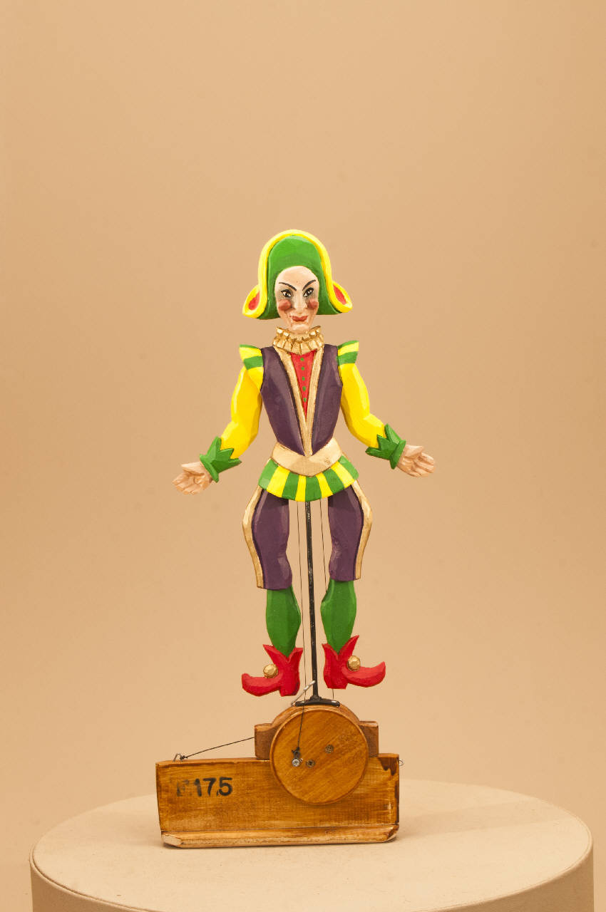 Corpo in legno di tiglio. Braccia e gambe raccordate al busto con viti che ne permettono l'oscillazione. Montato su un carrello con ruote che girando imprimono il movimento agli arti per mezzo di fili.