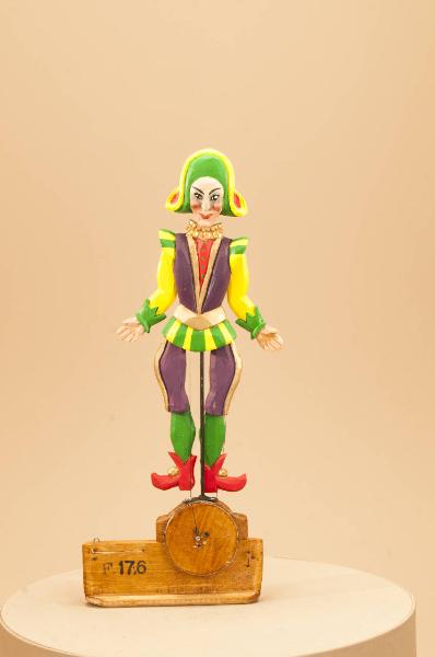 Corpo in legno di tiglio. Braccia e gambe raccordate al busto con viti che ne permettono l'oscillazione. Montato su un carrello con ruote che girando imprimono il movimento agli arti per mezzo di fili.