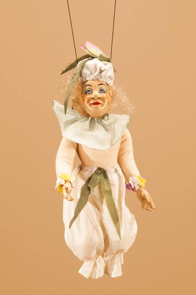 - NOTIZIE STORICO CRITICHE Questo figurino compariva, scendendo dall'alto, in una ghirlanda fiorita insieme ad altri 11 figurini simili, uniti fra loro da una corda colorata. Lo spettacolo "La Tempesta" fu commissionato dalla Biennale di Venezia nella persona di Franco Quadri, direttore del Settore Teatro, nel 1985. Eduardo De Filippo volle che ad interpretarlo fossero le marionette. Lo spettacolo, andato in scena un anno dopo la sua morte al Teatro Goldoni di Venezia, fu curato per la parte registrata, con la voce del celebre attore, dal figlio Luca De Filippo; per i costumi furono creati bozzetti da Maurizio Dotti, modificati in corso di allestimento da Eugenio Monti Colla; le scenografie furono affidate a Pierluigi Bottazzi, Maurizio Dotti e Riccardo Di Lauro. La musica fu composta e diretta dal maestro Antonio Sinagra, compositore di fiducia dalla famiglia De Filippo. Nella ripresa del 2013 furono realizzate nuove scenografie da Franco Citterio e alcuni nuovi elementi scenici e marionettistici.