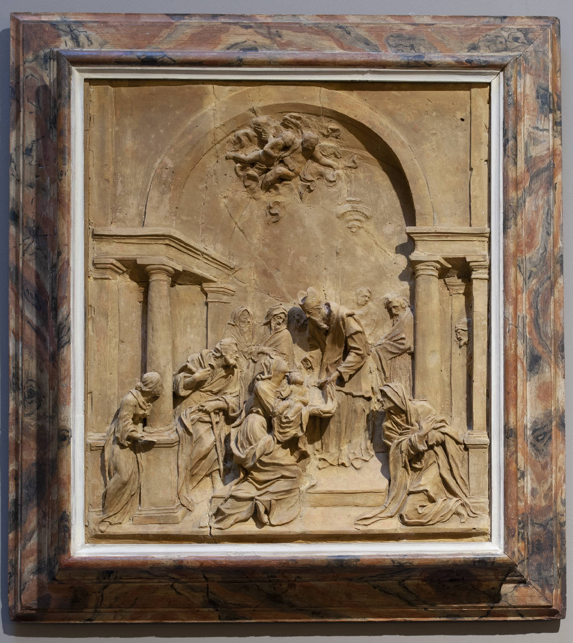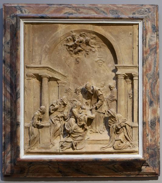 - NOTIZIE STORICO CRITICHE Il manufatto, che insieme ad altri rilievi conservati nella raccolta dell'Accademia Carrara fa parte della donazione Betty Ambiveri del 1962, è inserito in una cornice in legno modanato dipinto a finto marmo. Si tratta di un bozzetto in terracotta per uno dei sette bassorilievi marmorei dell'Altare della Pietà del Duomo di Bergamo eseguiti nel 1709 da Andrea Fantoni con l'aiuto della bottega. Di questi bozzetti alcuni sono conservati al Museo di Rovetta ("Riposo nella fuga in Egitto", "Caduta di Cristo sotto la croce", "Inchiodatura di Cristo sulla croce"), altri all'Accademia Carrara ("Presentazione al tempio", "Disputa fra i Dottori" e "Sepoltura").