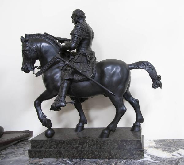 - NOTIZIE STORICO CRITICHE Donata nel 1980 al Comune di Bergamo da Maria Bresaola vedova di Ezio Sangiovanni e nel 1998 depositata dal Comune in Accademia Carrara, questa scultura è una copia novecentesca, anch'essa in bronzo fuso, del monumento equestre al Gattamelata realizzato da Donatello nel 1445-1453 e situato nella piazza di S. Antonio a Padova. Della statua di Donatello furono realizzate varie repliche e copie in diversi formati e materiali. \nLa scultura poggia su una base in porfido.