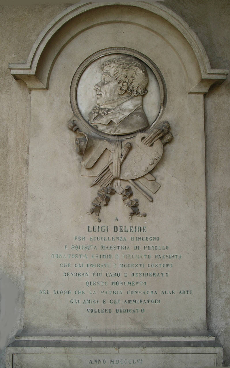 - NOTIZIE STORICO CRITICHE Nel 1856, tre anni dopo la morte di Luigi Deleidi, venne dedicata al pittore bergamasco questa lapide posta nel loggiato dell'Accademia Carrara. Il progetto architettonico venne eseguito da Antonio Andrea Galetti, mentre a Innocenzo Fraccaroli venne affidata la realizzazione della medaglia raffigurante il busto di profilo del Deleidi. Il 7 ottobre dello stesso anno usciva sulla prima pagina della "Gazzetta di Bergamo", oltre all'attestazione di stima per l'opera, il testo integrale della lettera (Milano, 10 luglio 1853) con cui lo scultore comunicava la consegna della medaglia e la rinuncia di qualsiasi compenso. Fraccaroli, che in quegli anni aveva diradato le sue partecipazioni alle annuali mostre di Brera per dedicarsi alla committenza ecclesiastica e agli interventi monumentali, si era già distinto qualche anno prima, nel 1852, per l'esecuzione del Monumento a Giovanni Simone Mayr destinato alla Basilica di Santa Maria Maggiore. Il nome di Fraccaroli si legherà ancora a quello del bergamasco Antonio Andrea Galetti per il progetto dell'altare del S. Rosario nella chiesa di Castrezzano.