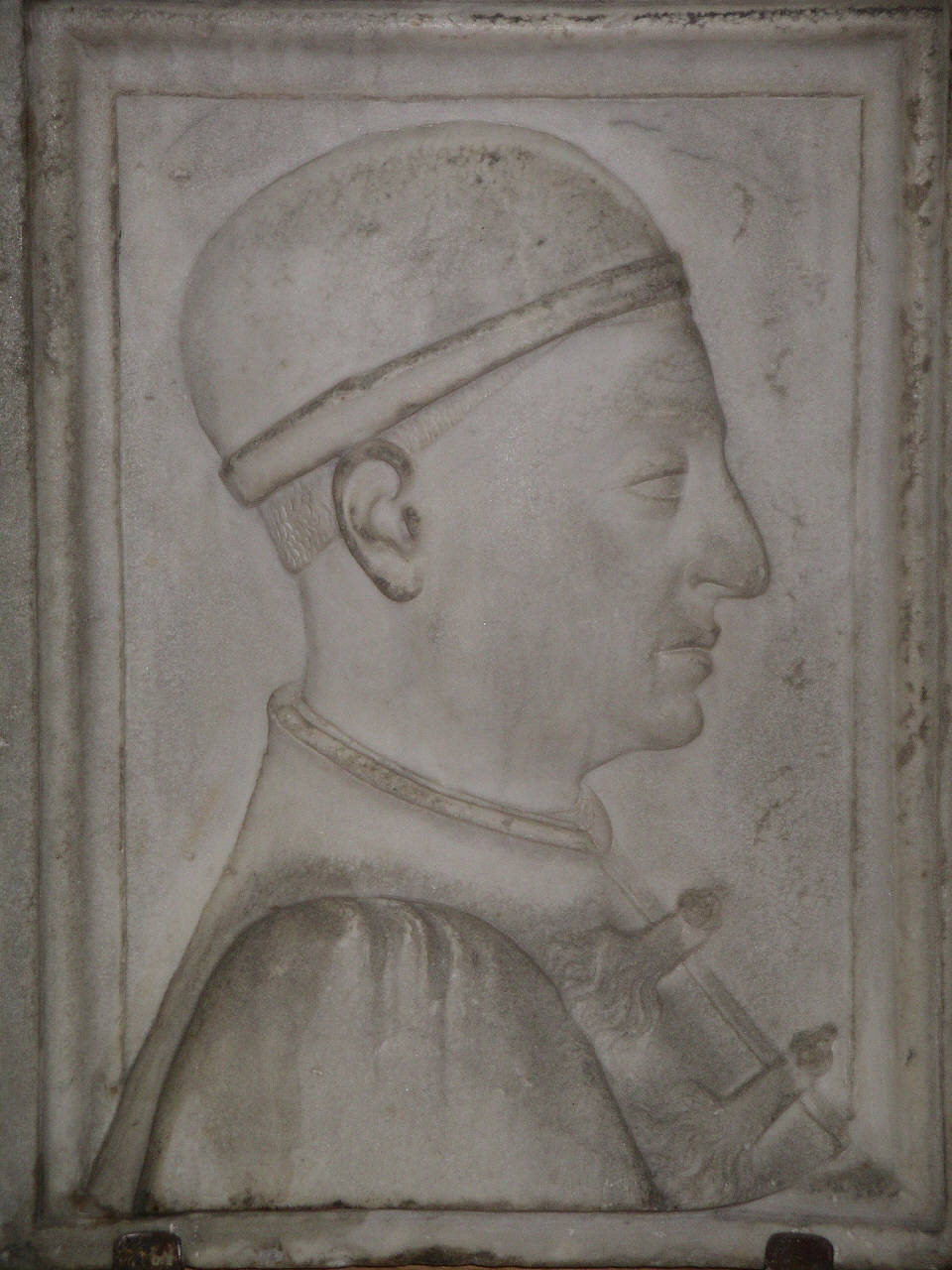 - NOTIZIE STORICO CRITICHE Inserita in una cornice sagomata, questa figura maschile di profilo si presenta fortemente caratterizzata da alcuni dettagli di costume come il berretto di feltro, i capelli tagliati secondo una moda di origine borgognona (che si ritrova anche nel "Busto di Piero de' Medici" di Mino da Fiesole conservato al Bargello a Firenze), la zazzaretta alla bergognona e i fermagli bottonati del corsetto.\nAvvicinato con prudenza all'ambiente ferrarese della seconda metà del XV secolo da J. Pope-Hennessy e da F. Zeri (Londra, 1984, p. 124), il bassorilievo non sembra tuttavia trovare precisi termini di confronto con la coeva scultura estense. La definizione dei tratti del volto sembrerebbe rifarsi piuttosto alla produzione di Cosmè Tura o Baldassarre d'Este. Realizzato con ogni probabilità nell'ultimo quarto del secolo, il rilievo presenta diverse analogie con un "Profilo di gentiluomo" conservato al Philbrook Art Center di Tulsa (Oklahoma) che, nel catalogo della collezione Kress (cfr. Middeldorf, 1976, n. 51, p. 67) è attribuito ad un anonimo artista emiliano della seconda metà del Quattrocento ("Il conoscitore d'arte...", 1989, pp. 20-21).