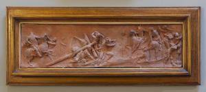 - NOTIZIE STORICO CRITICHE Il rilievo, inserito in una cornice in legno di noce modanato, è collegabile alla progettazione della "Caduta di Gesù sotto la croce", bozzetto in terracotta per uno dei sette bassorilievi dell'Altare della Pietà nella Cattedrale di Bergamo conservato, insieme a "Riposo nella fuga in Egitto" e "Inchiodatura di Gesù sulla croce", al Museo Fantoni di Rovetta. I bassorilievi in marmo raffiguranti i sette dolori di Maria furono eseguiti da Andrea Fantoni con l'aiuto della bottega nel 1709.