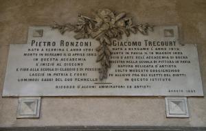 - NOTIZIE STORICO CRITICHE Donata nel 1889, la lapide marmorea commemora i pittori bergamaschi Pietro Ronzoni e Giacomo Trecourt, entrambi formatisi presso la scuola dell'Accademia Carrara. Come ricorda la dedica, venne fatta realizzare da ammiratori e artisti. In alto è ornata da alcuni elementi decorativi che simboleggiano le Arti.