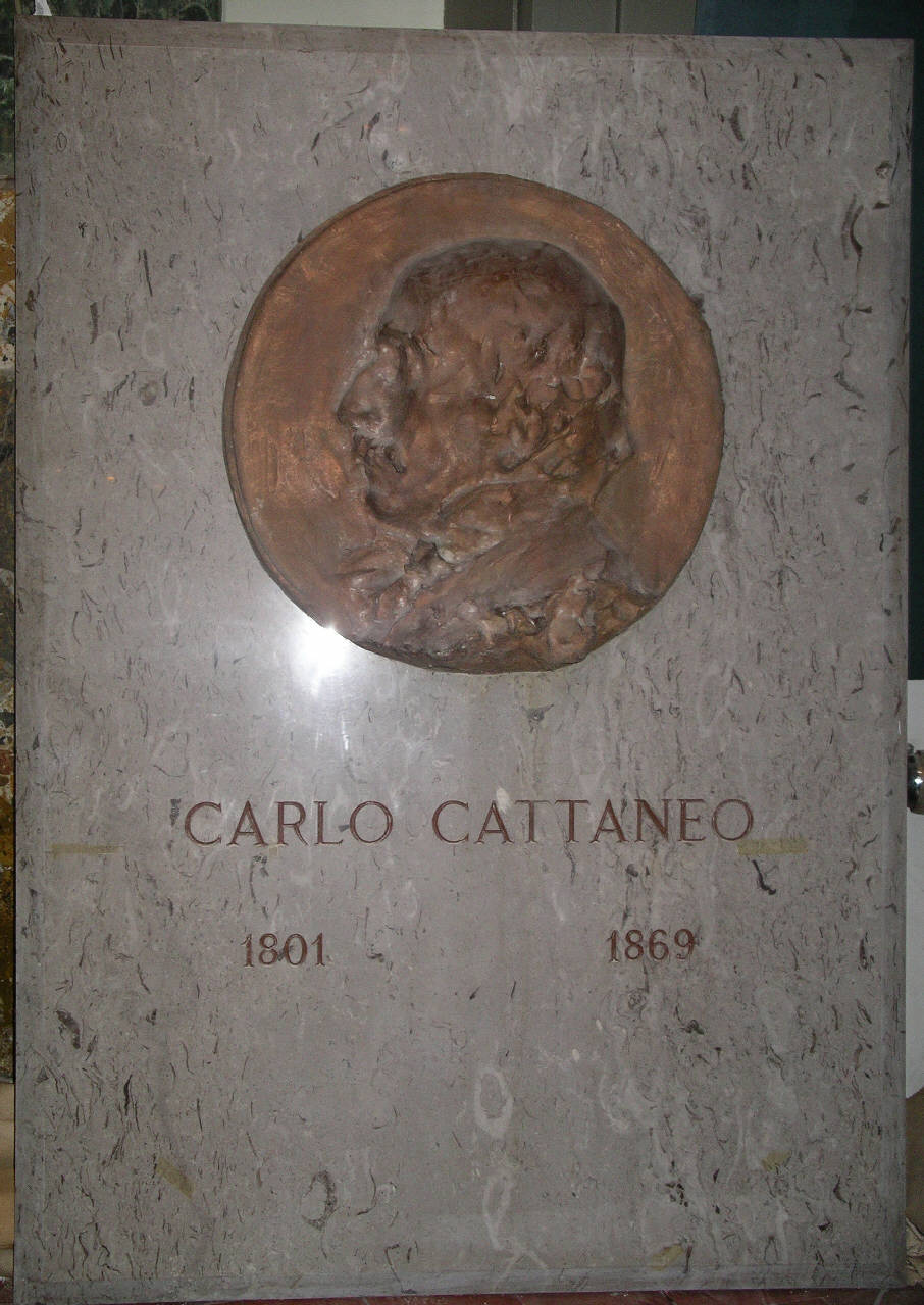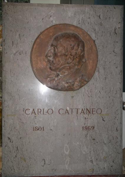 - NOTIZIE STORICO CRITICHE La lapide marmorea commemora la figura dello storico, economista e politico Carlo Cattaneo (Milano, 1801 - Castagnola, Svizzera, 1869), ritratto di profilo nel medaglione in bronzo. Cattaneo auspicava per gli stati italiani il raggiungimento dell'indipendenza e la costituzione di un nuovo stato libero dall'influenza austriaca. Nel corso delle Cinque Giornate di Milano si occupò dell'organizzazione politica della rivolta. Deluse le speranze rivoluzionarie, si trasferì prima a Parigi poi a Lugano. Non volle mai giurare fedeltà alla monarchia e per questo rinunciò alla carica di deputato.