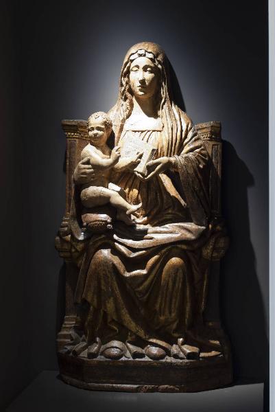 - NOTIZIE STORICO CRITICHE Come suggerisce la parte posteriore non lavorata, questa grande Madonna lignea, seduta in trono con in grembo il Bambino in atto di benedire, era destinata ad essere addossata alla parete, probabilmente di una nicchia. La lacunosa iscrizione presente sulla base del trono contiene con ogni probabilità un'invocazione alla Vergine. Realizzata quasi certamente nei primi anni del Cinquecento, come suggeriscono la monumentalità della composizione, il carattere più sciolto dei panneggi e la tipologia della scollatura dell'abito della Vergine, questa scultura si colloca nel clima dell'Italia meridionale, soprattutto napoletano, dove sul finire del XV secolo ebbe inizio la grande diffusione della scultura lignea grazie ad una famiglia di maestri tedeschi di cui era capostipite Pietro, poi chiamato Alemanno. Stringenti affinità si riscontrano con opere uscite da quella bottega come non meno importante appare l'influenza delle opere del dalmata Francesco Laurana (1430 ca.-1502?), soprattutto per quanto riguarda la fissità quasi iconica dei volti ("Il conoscitore d'arte...", 1989, pp. 18-19).